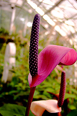 「アンスリウム」の品種改良の元になったもののようです。 サトイモ科の特徴の肉穂花序です。 いぼいぼが花粉を出してるのがわかりますか? 小ぶりですが、なかなかおしゃれな色で 存在感があります。