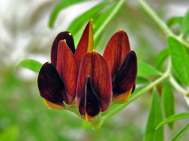 赤・白・黄色・紫色などの花色の多いマメ科の中で、これは地味ですね。 一見黒い花。でも、よく見れば、黄色のグラデーション。しかも、小さめの花です。