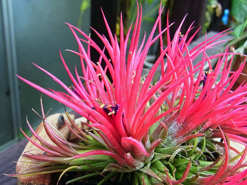フエゴとは、スペイン語で「炎(ほのお)」とか「火山」を意味し、この素晴らしい赤い葉の色づきから来てるようです。 因みに、ちょっとわかりにくいですが、中心にある青い部分が花で、黄色い点は、雄しべです。 原産地では、マングローブ林で着生しているもので、園芸業界では、エアープランツとして、紹介されています。 エアープランツとは、樹木や岩などに着生し、雨や霧などで濡れた葉から水分を吸収して生きていけるもので、植物なのに土を必要としません。 空気中の水分養分を受け止めるための、4〜5センチぐらいの長さの葉っぱは、毛がいっぱいです。 |